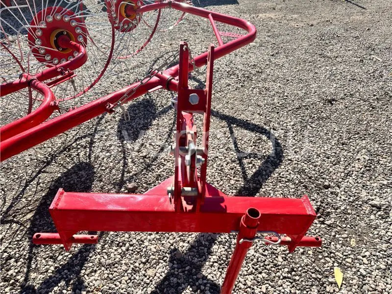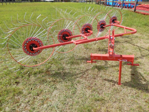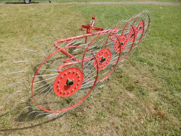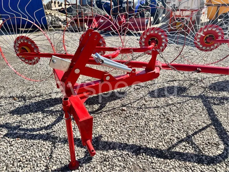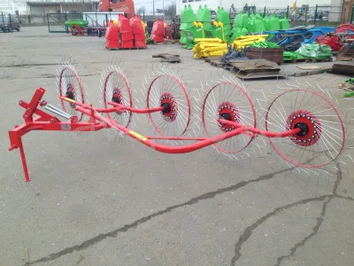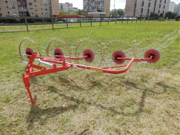 Данный агрегат не нужно соединять с ВОМ трактора. В рабочем положении его колеса опираются изогнутыми «лучами» на поверхность поля, и естественным образом приводятся во вращение во время движения трактора. В контакте с поверхностью поля одновременно находится 4-5 лучей каждого из пяти колес. В зависимости от выставленного положения агрегата, вращаясь, они ворошат и переворачивают зеленую массу, либо собирают её в валки. Несмотря на простую конструкцию, механизм работает с травой практически без пропусков.