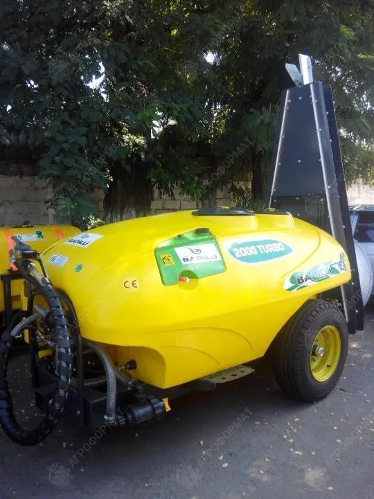 Прицепной вентиляторный опрыскиватель,бак-2000 литров, 4-х мембранный насос Comet Aps 145 л/мин,вес-540 кг, латунная форсунка, кардан в комплекте, функция самозакачки, гидравлическое смешивание удобрений.